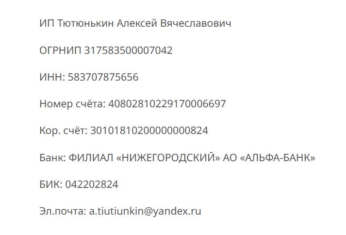 Исполнитель – лицо, направившее оферту, сторона по Договору ИП Тютюнькин Алексей Вячеславович, ИНН 583707875656, ОГРНИП 317583500007042